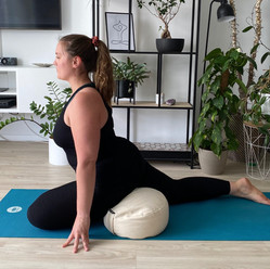 Mögliche Variante: In der späten Schwangerschaft, kannst du dir auch ein Kissen oder einen Yogabolster unter deine Brust legen und deinen Kopf entspannt darauf ablegen, so hast du noch mehr Platz für deinen Babybauch.